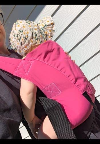 - Sleek one-piece design incorporating a large sun/sleeping hood that fastens with small buckles to the shoulder straps to keep baby shaded or support a sleeping head.