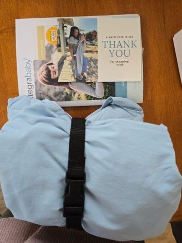 - Sleek one-piece design incorporating a large sun/sleeping hood that fastens with small buckles to the shoulder straps to keep baby shaded or support a sleeping head.