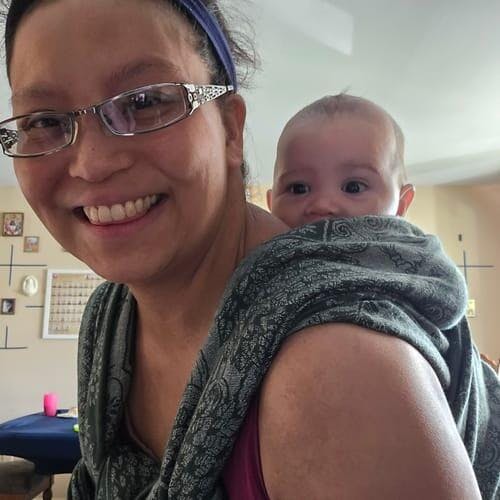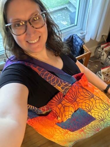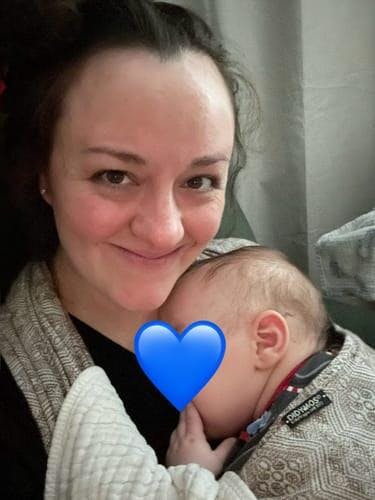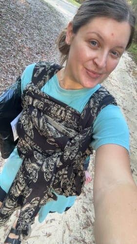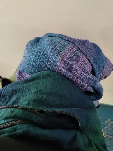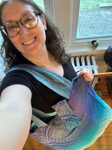 I was so excited about this one! Everything I read said the Lisca Minos feels like a stretchy wrap but with way more support — and it’s totally true. It’s unbelievably soft right out of the box and just so comfortable. The colors are gorgeous in person too — it’s mostly black threads with this pop of hot pink and teal blue that looks even better in real life. I originally bought the Stracciatella thinking it would be my “one and done,” but I kept hearing about how soft this one was and finally caved… and I’m so glad I did. It’s definitely warmer and thicker than my Stracciatella, but it feels so cozy and supportive. No regrets at all — this wrap is just beautiful!