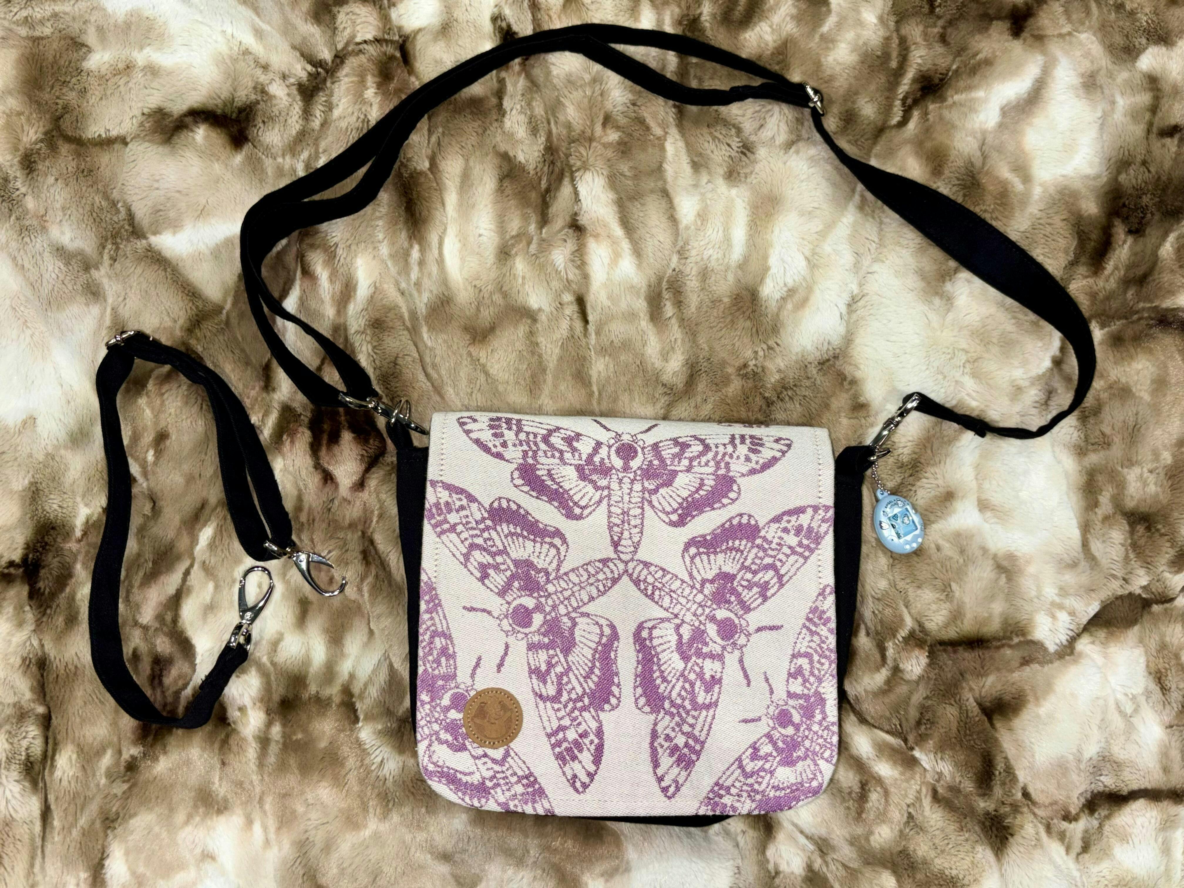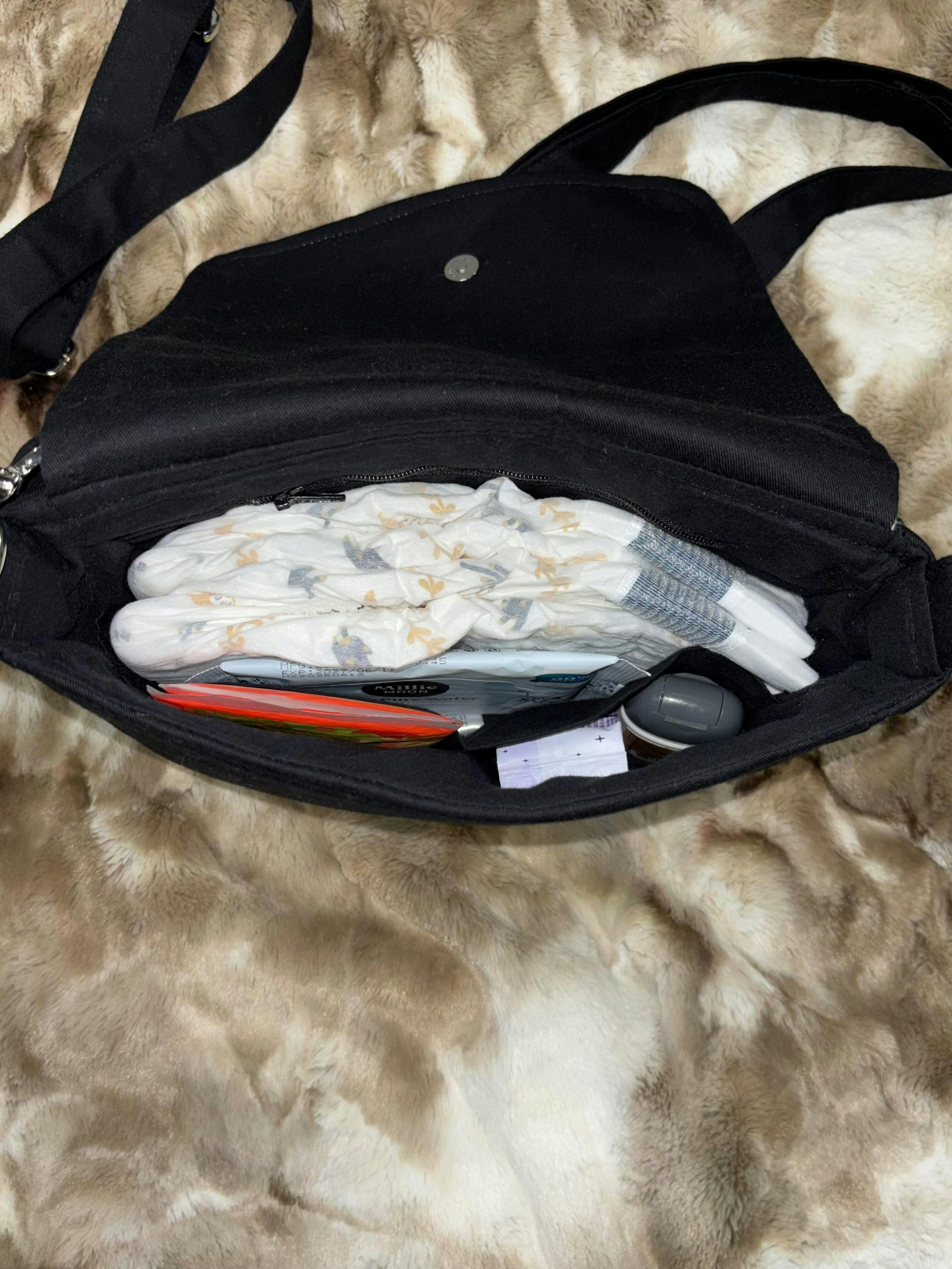 Beautifully well made bag, comes with a crossbody strap and short strap for waist carry. Small but fits a lot, can comfortably fit two size 4 diapers, wipes, hand sanitizer, phone, keys and cards/money. Has become our quick go to bag for errands.