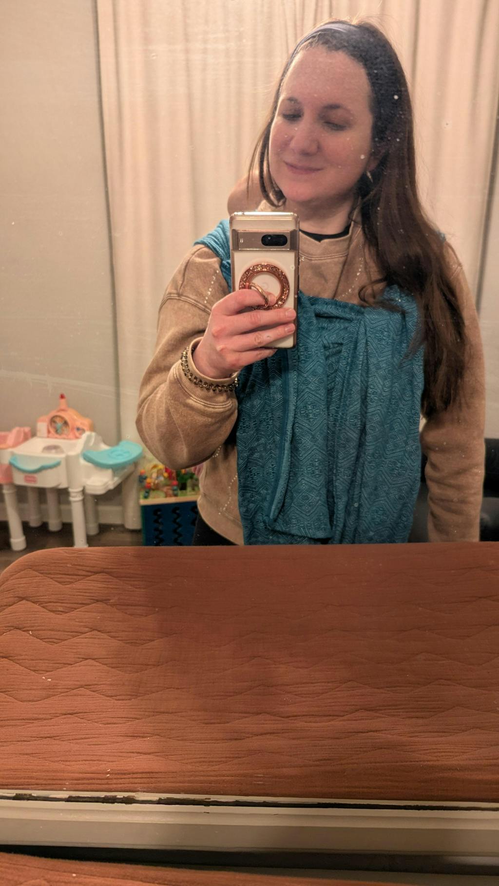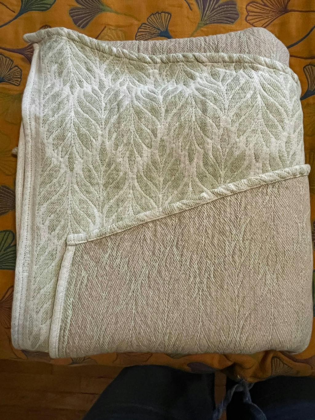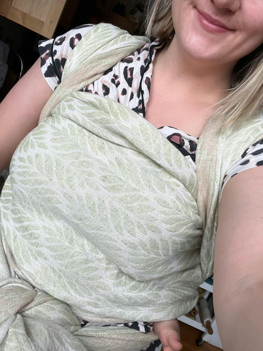 This wrap is so perfect! A beautiful soft green and very warm. Iβm not wool sensitive but I canβt feel any wool itch. Perfect bounce and cushion so itβs very comfortable for longer carries.