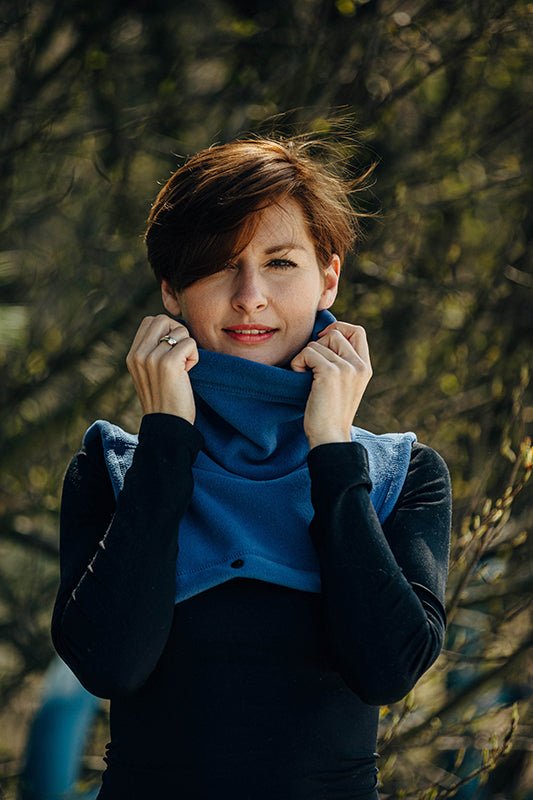 The turtleneck is composed of 2 parts that can be detached from one another, and is made from high quality thick and warm fleece. The part for the baby perfectly covers the head, ears, neck, and chest. Baby’s hood detaches and the remaining adult half makes a great neck warmer for the wearer.