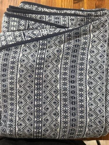 A light to medium weight fabric, airy and a bit of fluffy texture. Super classy - with dark blue and white in the warp (long ways) and weft (short way).