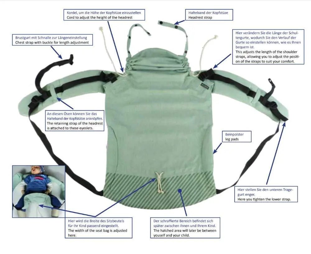 - Back panel made from Didymos high quality wrap fabrics with inherent diagonal stretch allowing the panel to conform to your child‘s shape and to create a supportive and comfortable pouch.