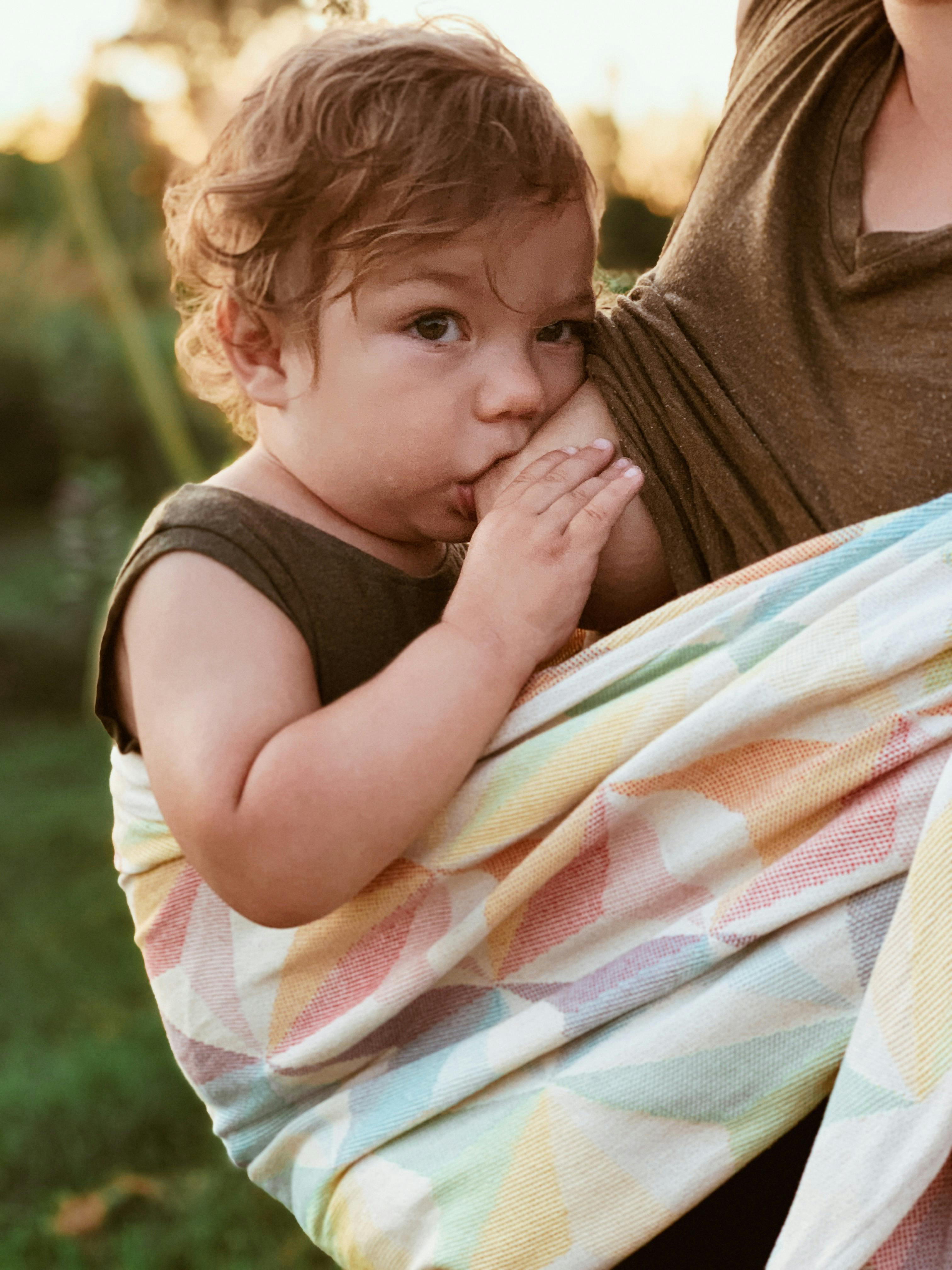 Didymos Zephyr is an outstanding new weave, based on an idea by Maggie Stickney. Very comfortable, easy to wrap with, and beautiful! Great for beginners and experts alike. Kids love pinwheels and the classic pinwheel design has been a favourite with quilters for decades. Inspired by Maggie from Purple Elm Baby, DIdymos decided to create a pinwheel pattern for our baby wraps.