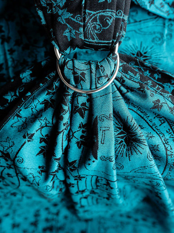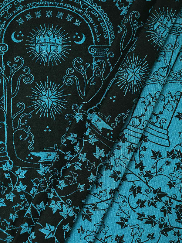 The Doors of Durin are shown in an effervescent blue against a black backdrop, intended to represent the magical moment when the Sindarin word for 'Friend' (Mellon) is spoken by Gandalf and the gateway is opened to the travellers of the Fellowship, after generations lying closed to the world. The placement of the Doors is such that the whole of the door will lie across your little ones back when wrapped - meaning the Door sits in the top two thirds of the wrap width, with a cascade of ivy flowing through the bottom third, much of which will be tucked under the seat when is use.