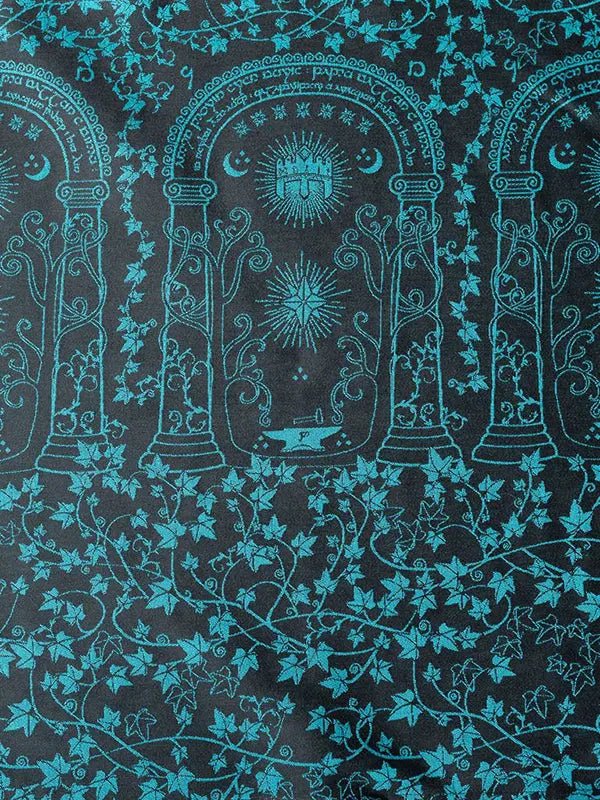 The Doors of Durin are shown in an effervescent blue against a black backdrop, intended to represent the magical moment when the Sindarin word for 'Friend' (Mellon) is spoken by Gandalf and the gateway is opened to the travellers of the Fellowship, after generations lying closed to the world.