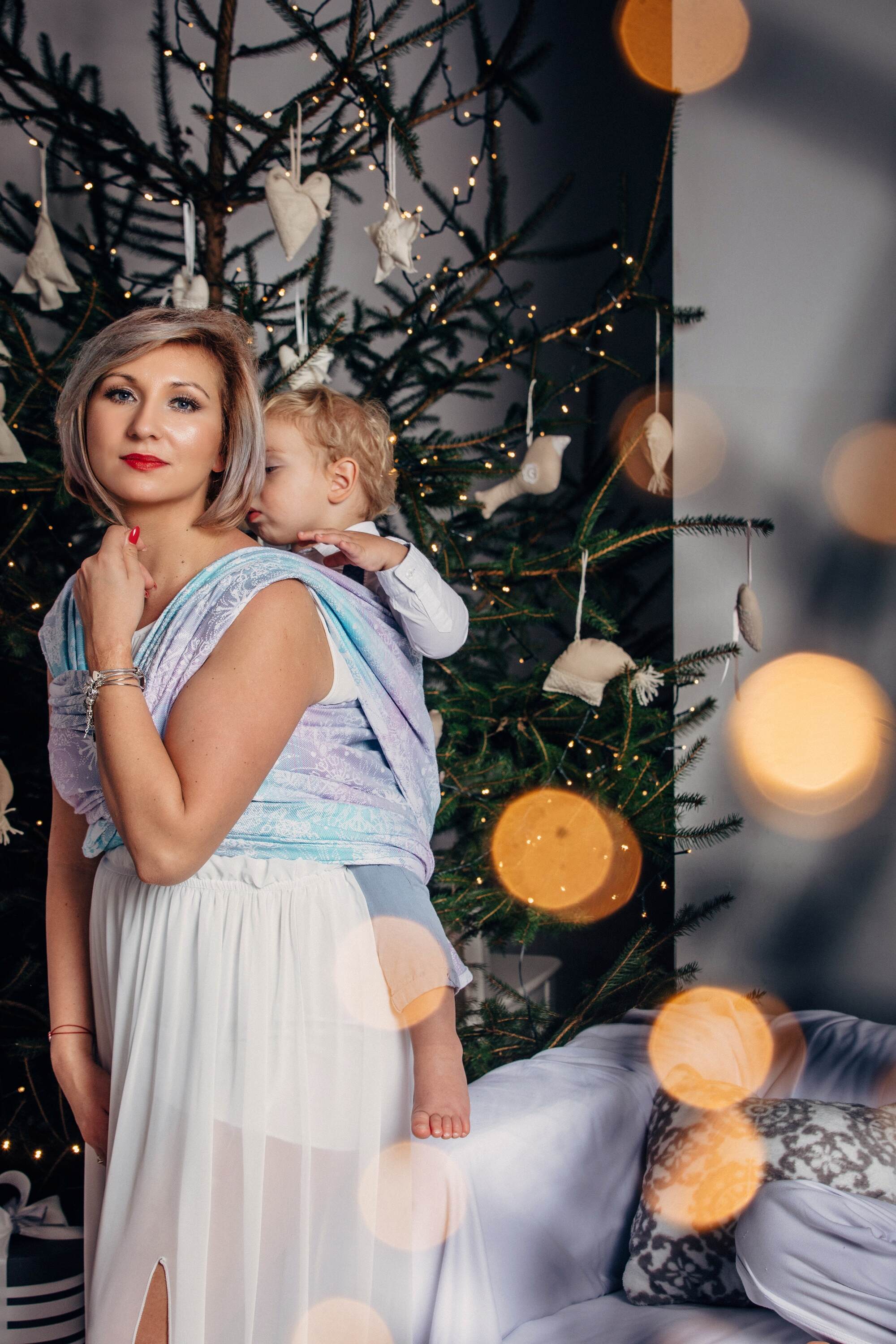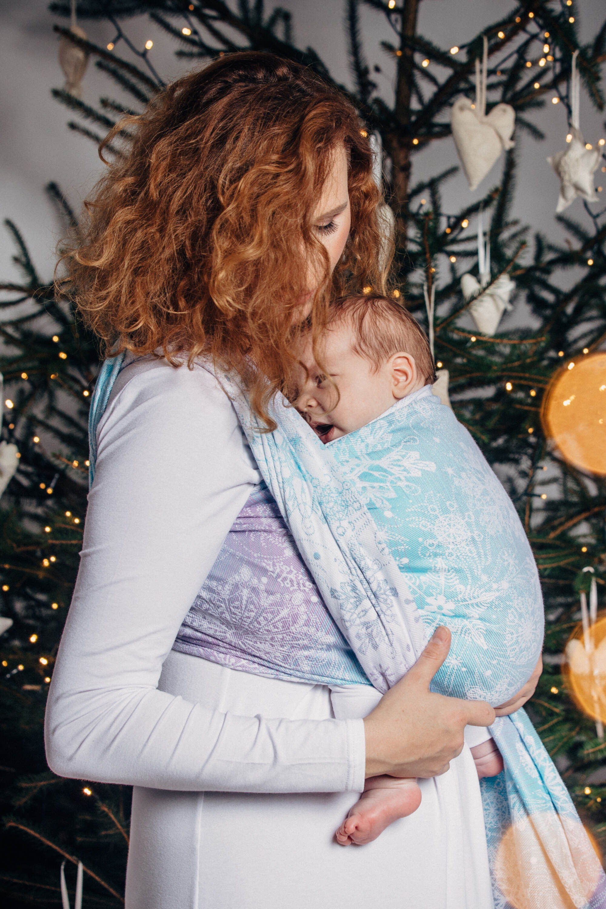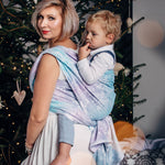 Glittering Snow Queen Design: A stunning winter-inspired design featuring sparkling silver and icy blue tones, reminiscent of a magical frozen wonderland. This exclusive colorway combines elegance with enchantment, perfect for creating memorable babywearing moments.