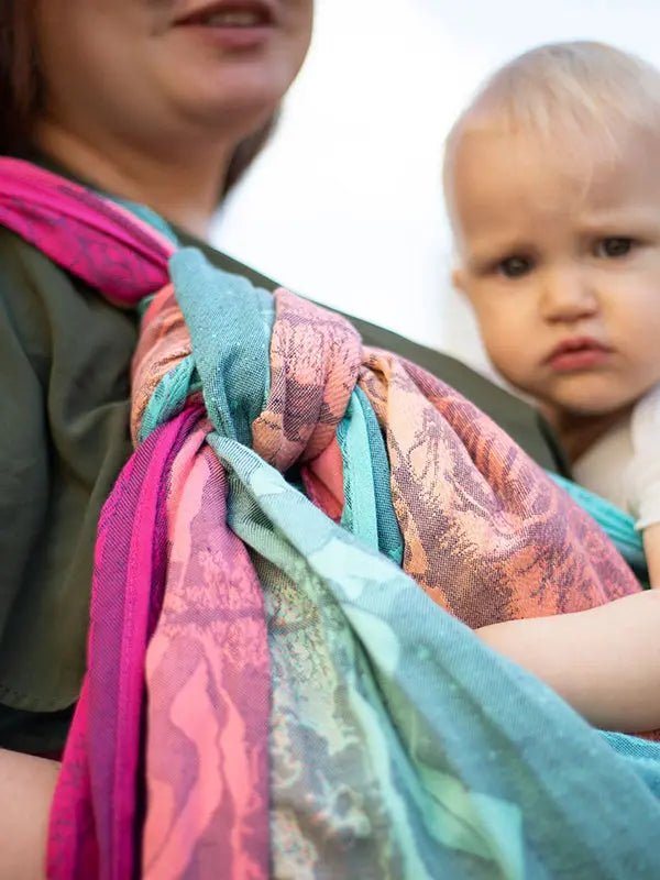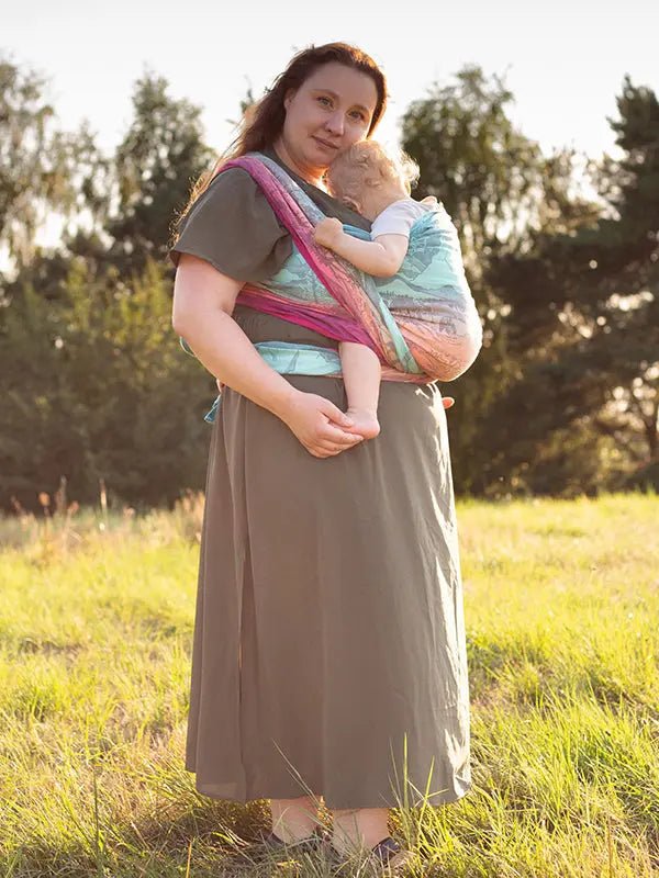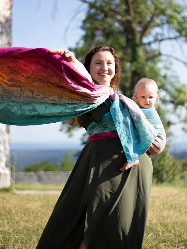 Hobbit Quest Into The Sunset is a strong and supportive wrap with a delightful gradient of colours, bringing the essence of a sunny afternoon to your babywearing experience. This hemp blend offers secure, comfortable carries and is perfect for bigger children and toddlers. Medium in hand, it will soften quickly into a great all-rounder from newborn to preschooler.