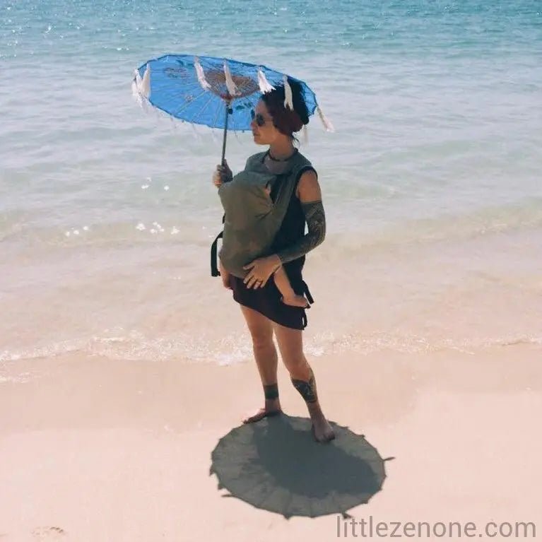 This sleek one-piece design incorporating a large sun/sleeping hood that fastens with small buckles to the shoulder straps to keep baby shaded or support a sleeping head. the ideal hot weather baby carrier but also versatile in all seasons.