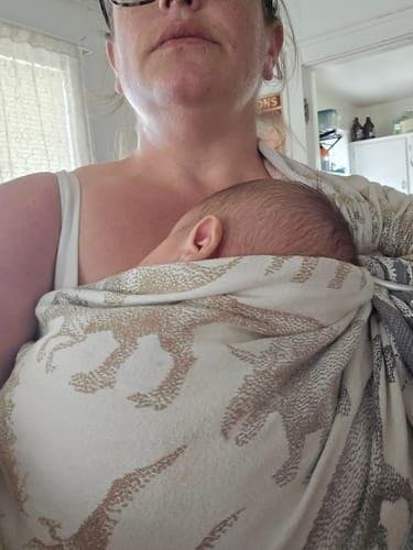 No tying necessary! Just put the sling through the rings, put the baby in the pouch and tighten. It is lightweight and takes up very little space.