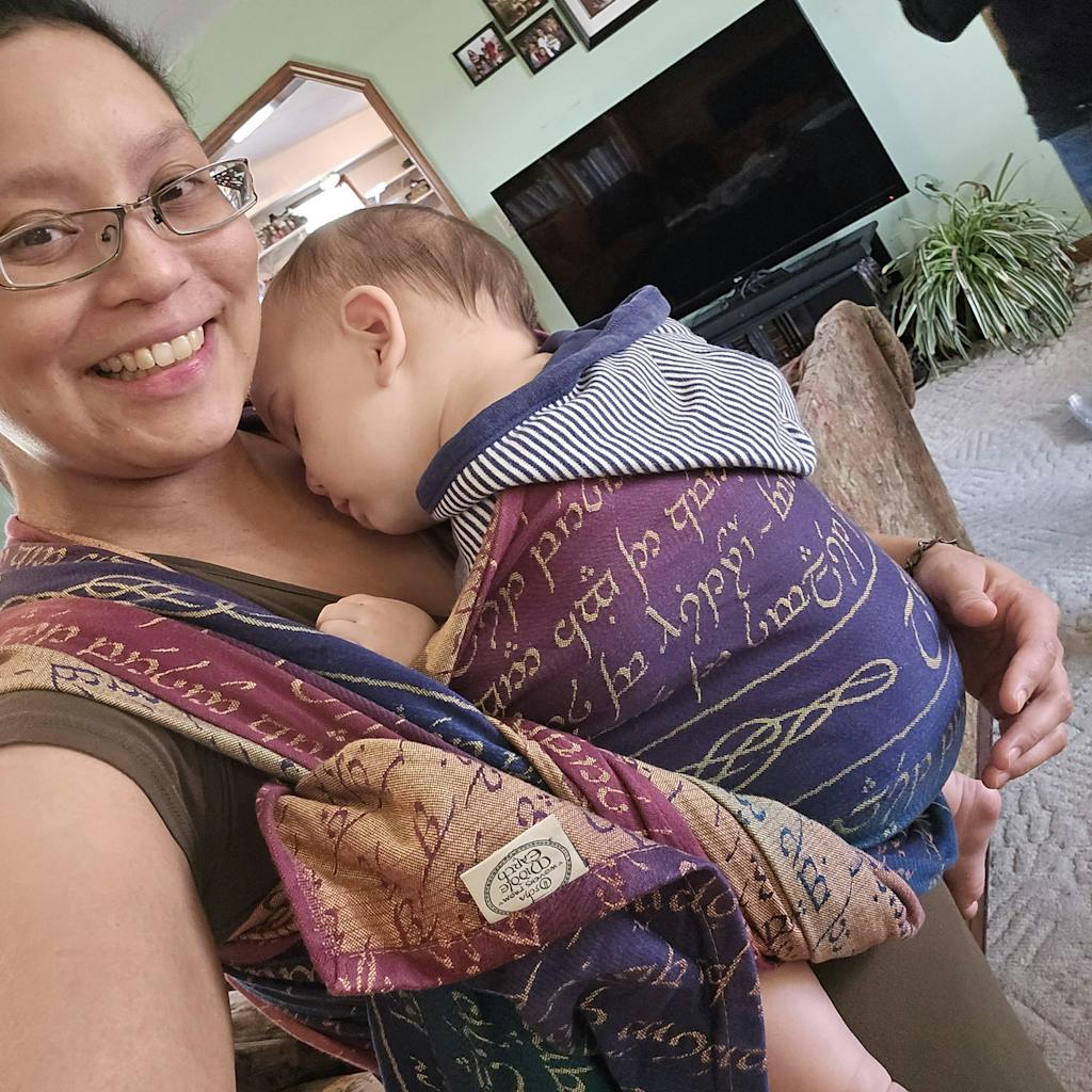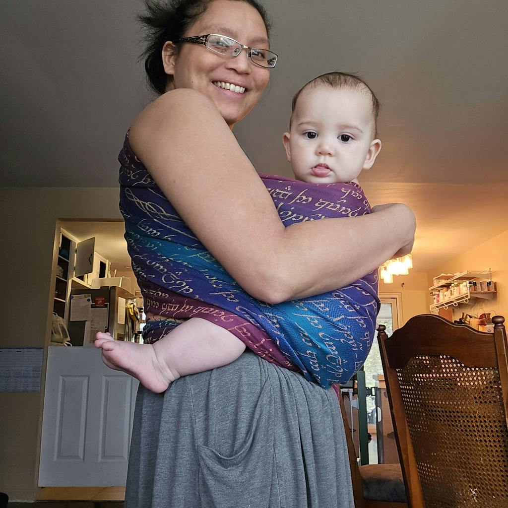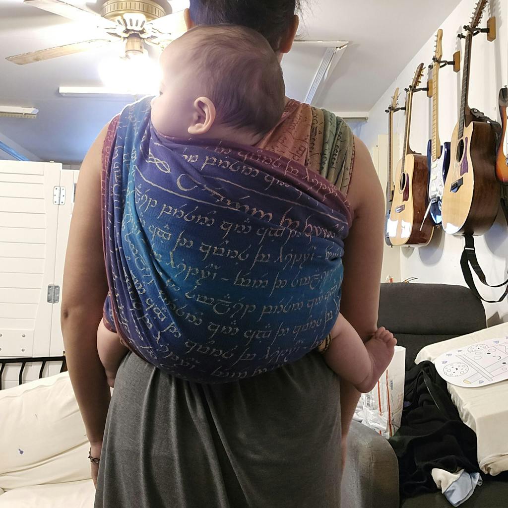 Woven with 100% BCI cotton, this vegan fabric is very strong and will offer supportive carries for all ages. Perhaps a little thick for tiny newborns but will be perfect from around 6 weeks, through toddlerhood. The lovely texture of the Legend of Frodo pattern gives it a good balance of grip and glide.