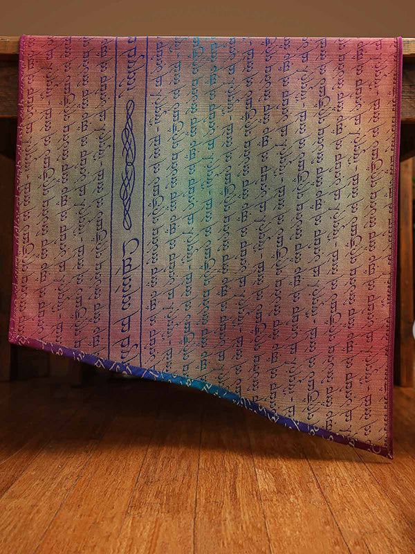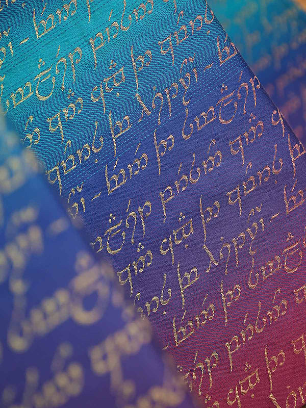 The Elven text and swirling motifs are woven in 3 different colours, rich rusty orange fades into a warm beeswax yellow and then a zesty green, set against a jewel toned gradation. This dramatic combination of colours creates a stunning, eye-catching fabric.