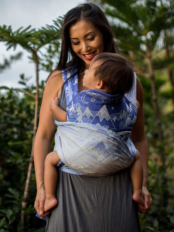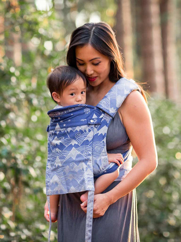 A fade of blues moves from deep midnight tones through lighter hues to a pale, icy blue mist. This beautiful EcoCotton and organic cotton baby carrier offers a lovely balance of softness, cush and strength.