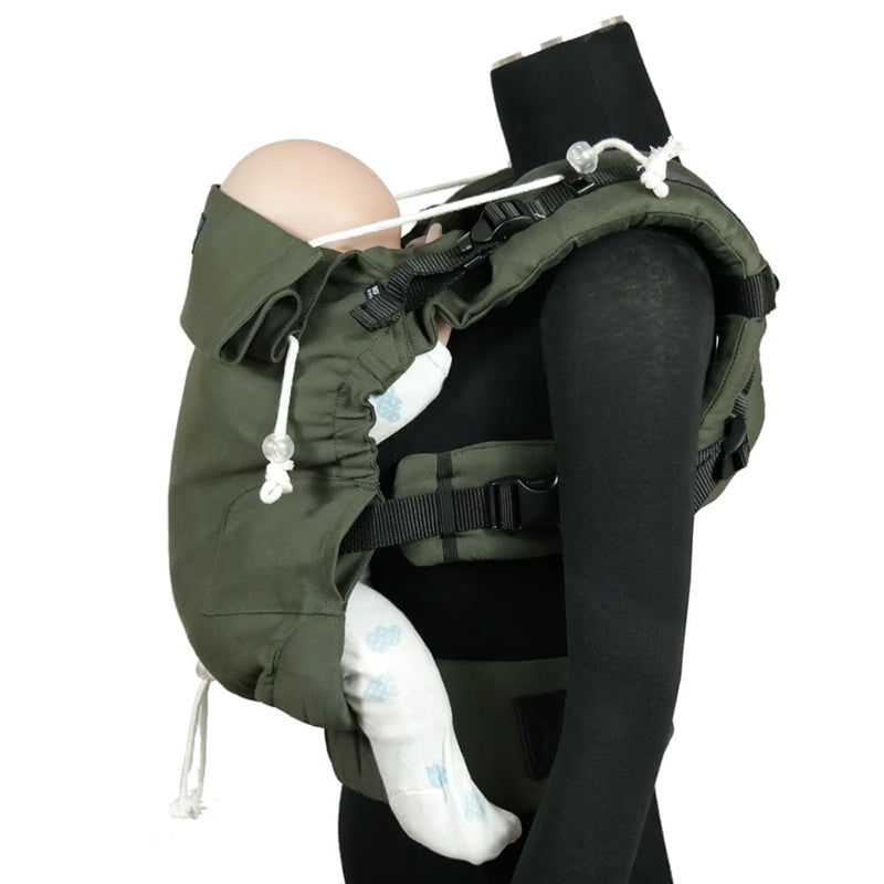 The continuously adjustable seat width and an additional drawstring on the panel support the ergonomic spread-squat-position - for a small newborn or a larger child - ONE carrier, from birth to walking age.