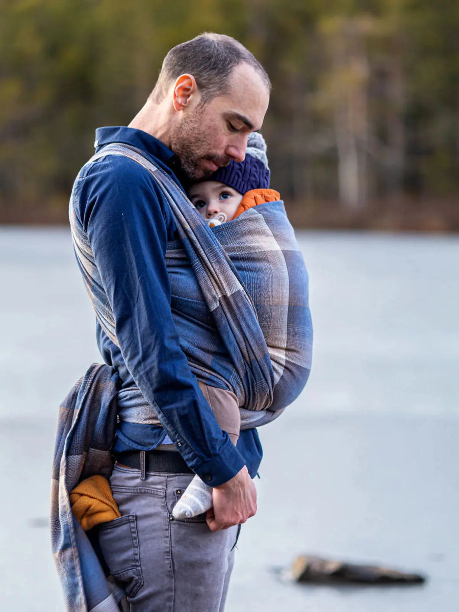 This traditional yet contemporary looking tartan is woven in navy, blue and golden browns. The varying hues of colour within each shade add a depth and texture, giving this wrap a rustic and timeless feel. It evokes thoughts of the Highland landscape, historic Scottish living and the generations who used the plaid to carry their little ones. The colours create a sense of warmth and cosiness that is perfect for snuggling up with your baby.