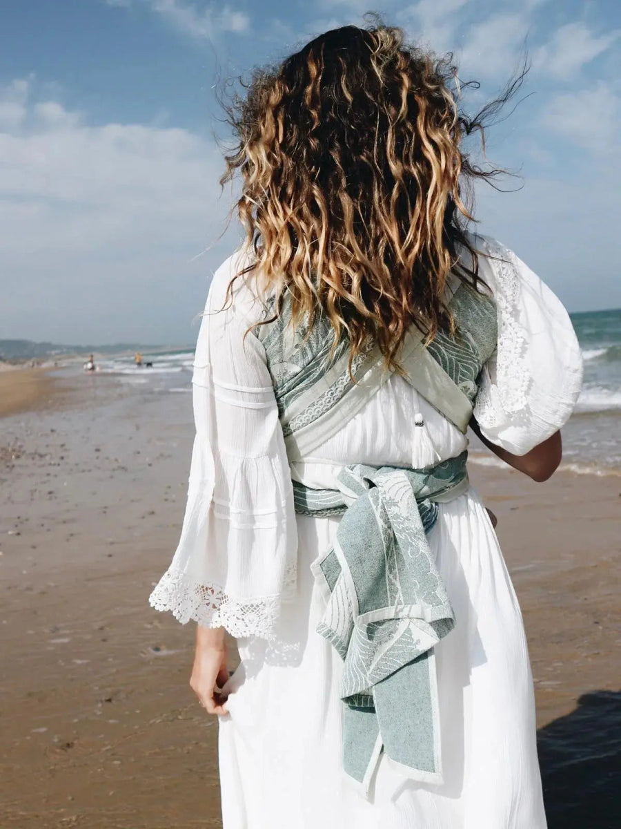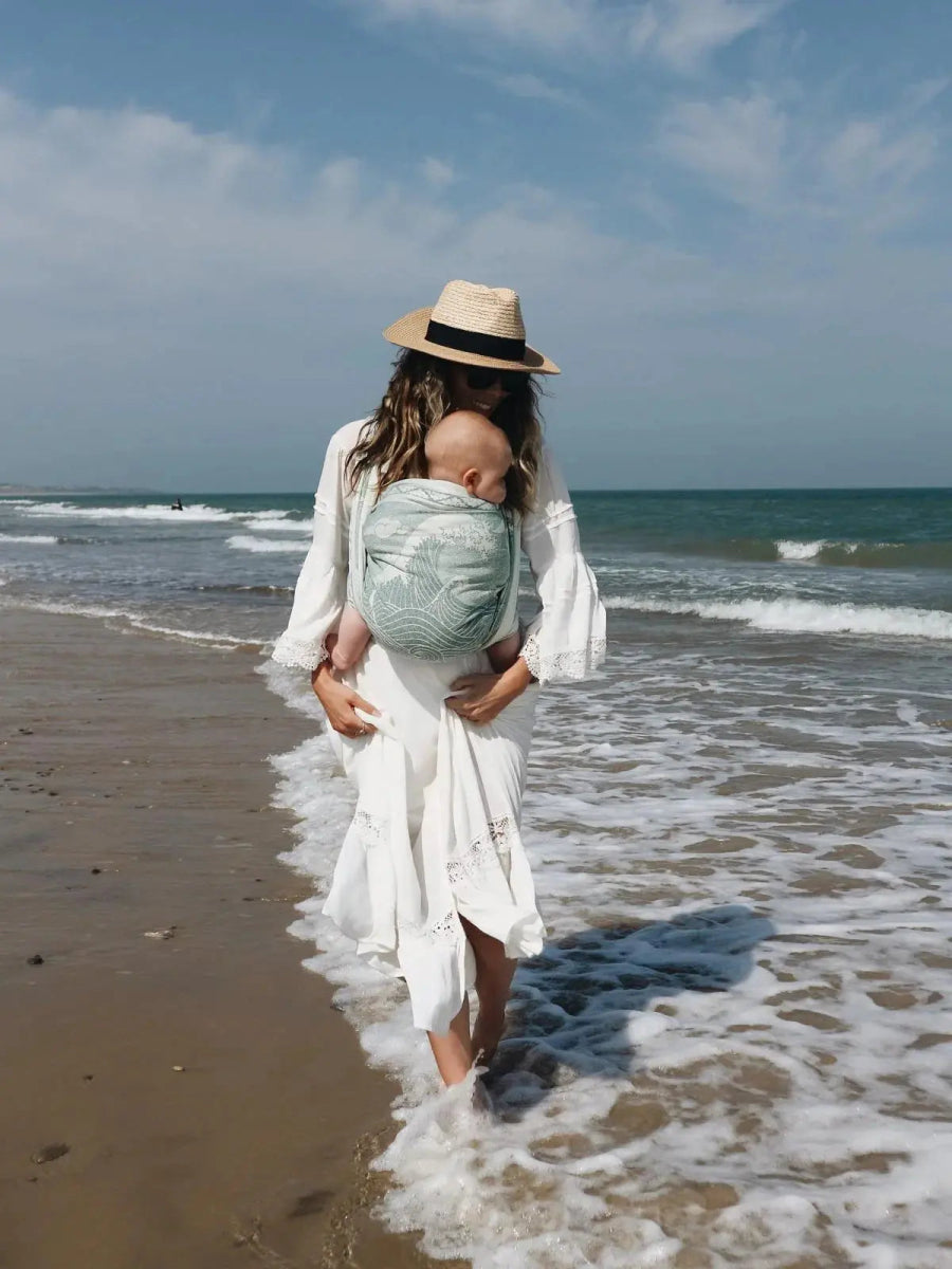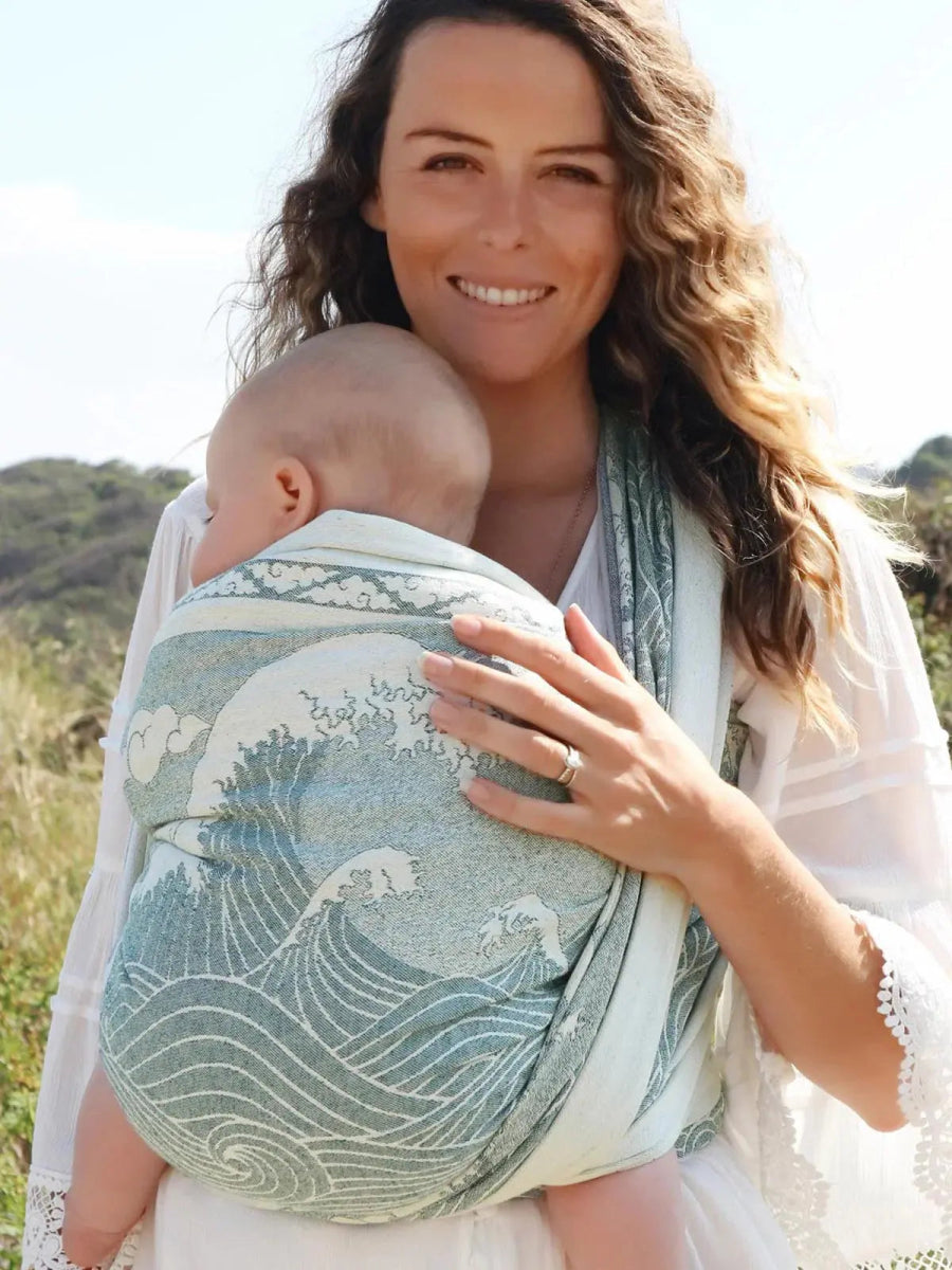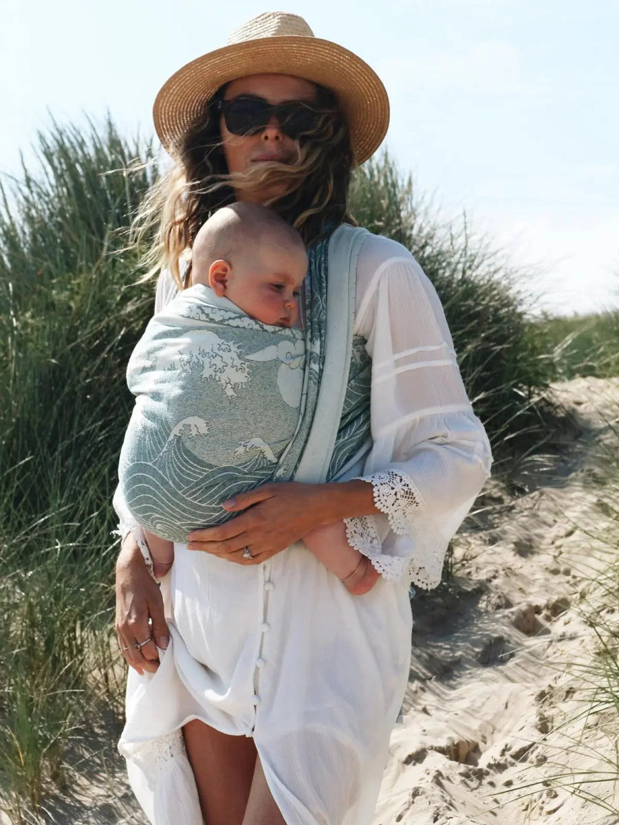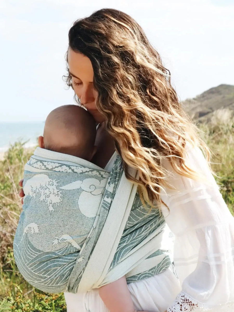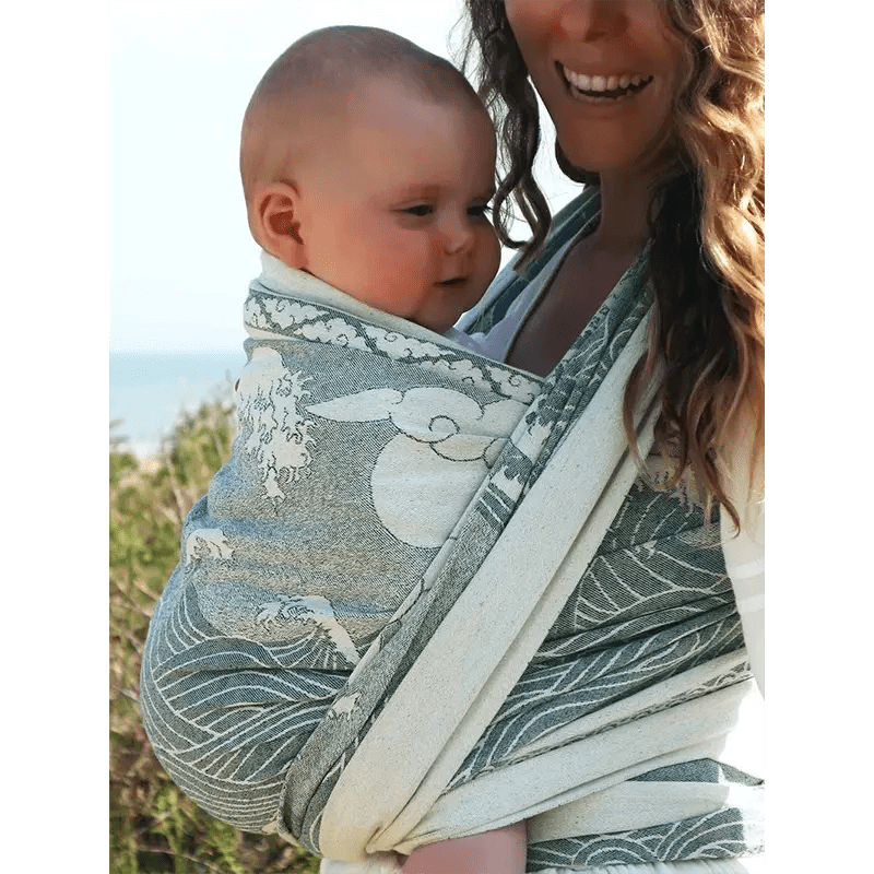 A soft blue-teal contrasts with natural ecru tones to bring a wonderfully vintage feel to our Okinami pattern. A lovely slubby yarn, our cotton and hemp blend speckles this fabric with little flecks bringing a soft and earthy feel to this beautiful baby wrap.