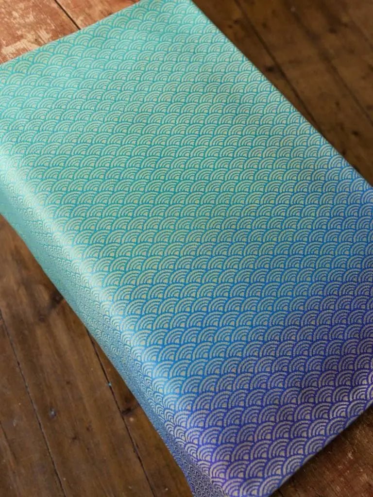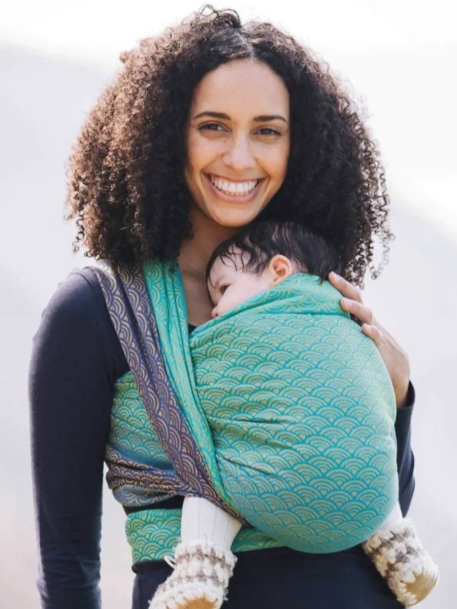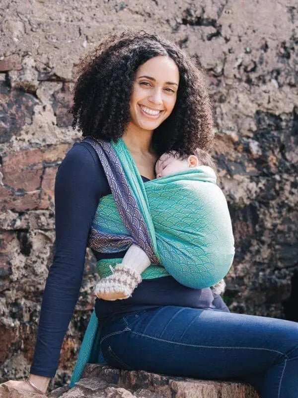Woven on a gorgeous fade of fresh ocean blues this beautiful baby wrap features a blend soft organic cotton and shimmery golden Tencel for a lovely, buttery soft baby carrier.
