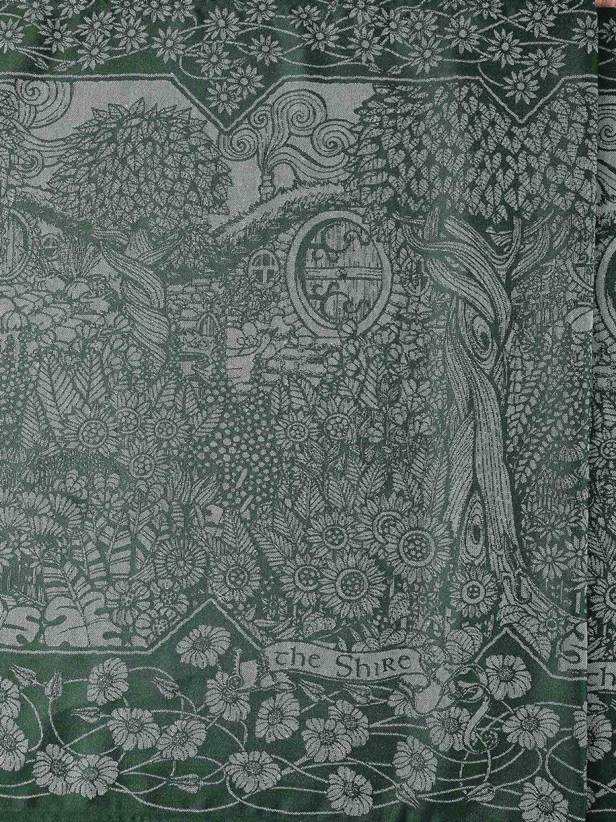 Shire Westfarthing is named after the Westfarthing, one of the four Farthings of the Shire and the centre of Hobbit authority. This beautiful fabric is woven on a deep forest green organic cotton backdrop. The bustling Shire pattern is picked out in alternating Tencel and hemp yarns in white.