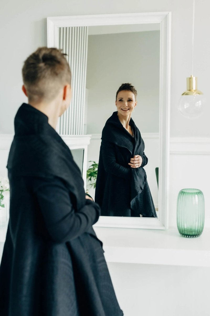 This cardigan is made of high quality woven fabrics and the sleeves are a soft and stretchy ribbing. This cardigan is versatile as it will cover your pregnant belly, a baby in a carrier, or wear it on it's own!