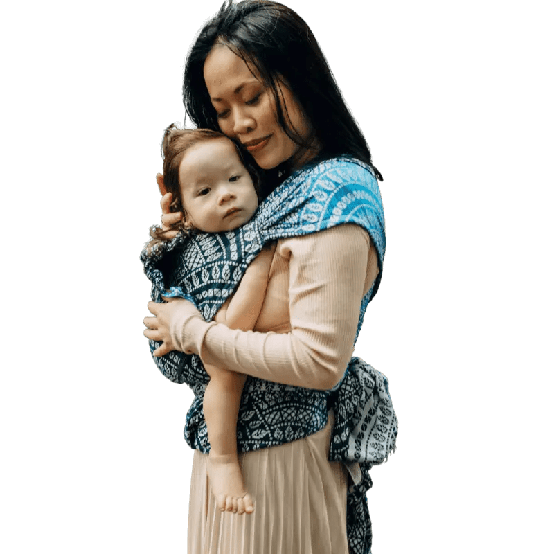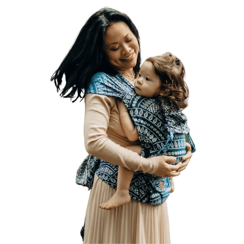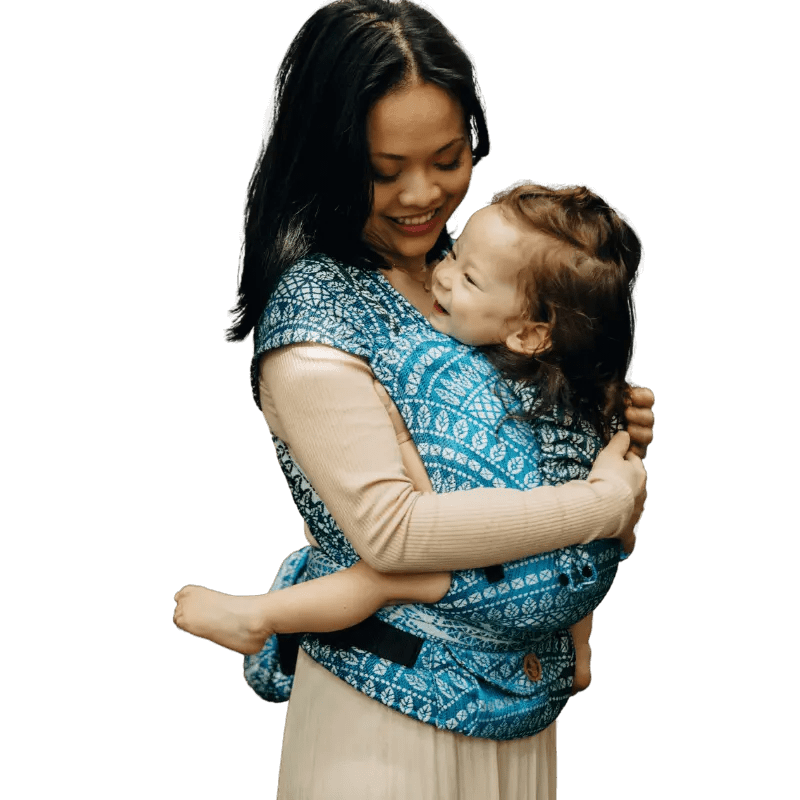 Peacock's Tail Sea Angel Hybrid Half Buckle by Lenny Lamb. From birth to about 24 months, a comfortable carrier that is easy to use and distributes weight well.