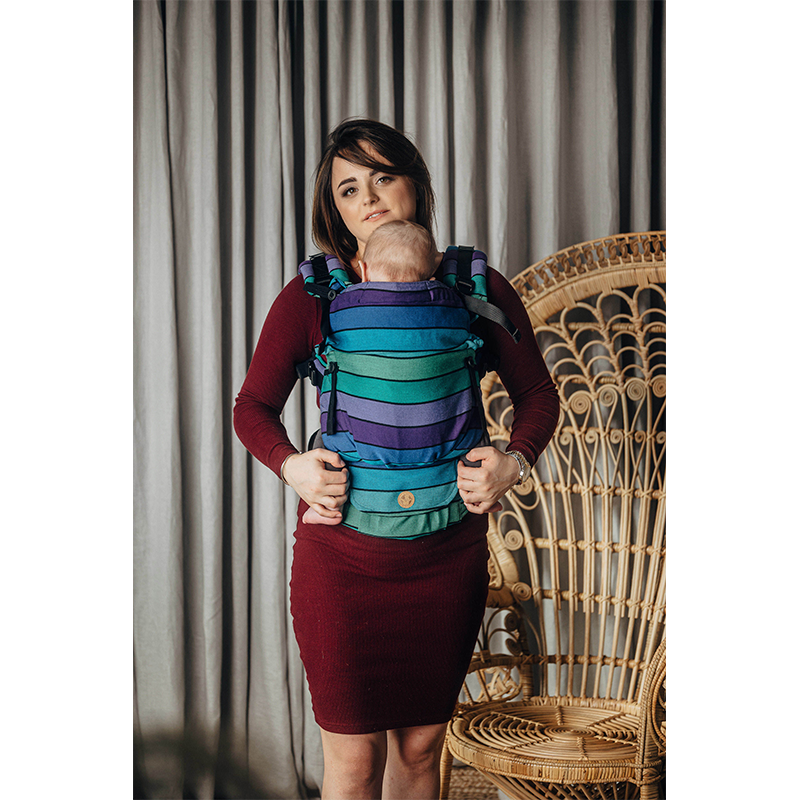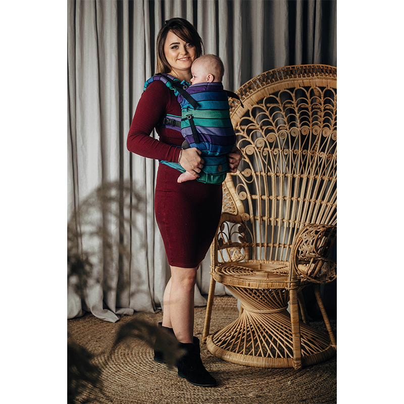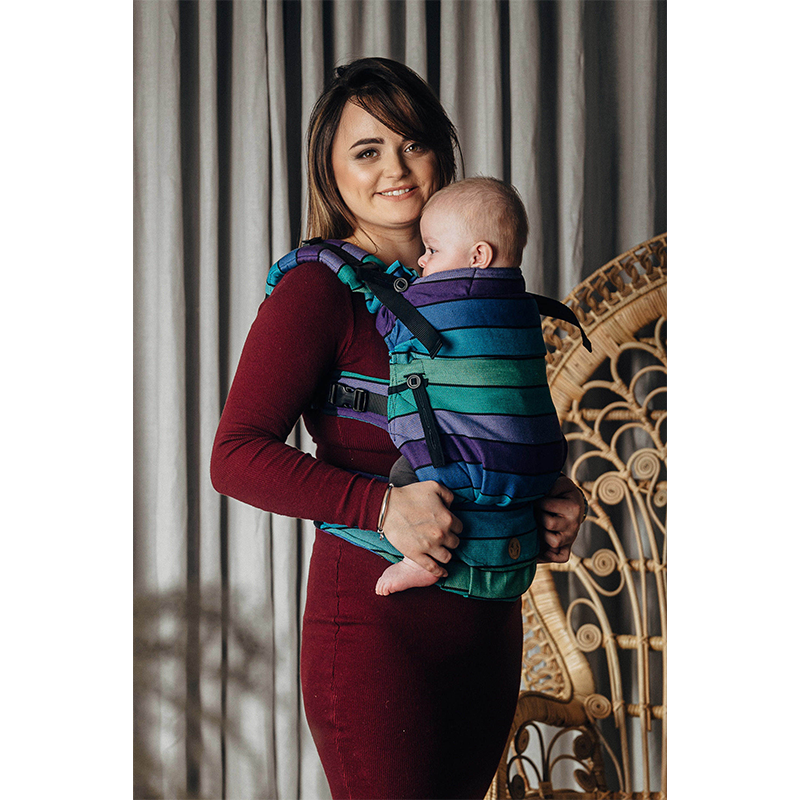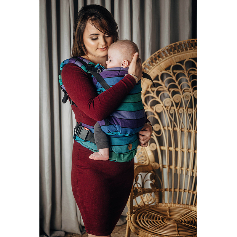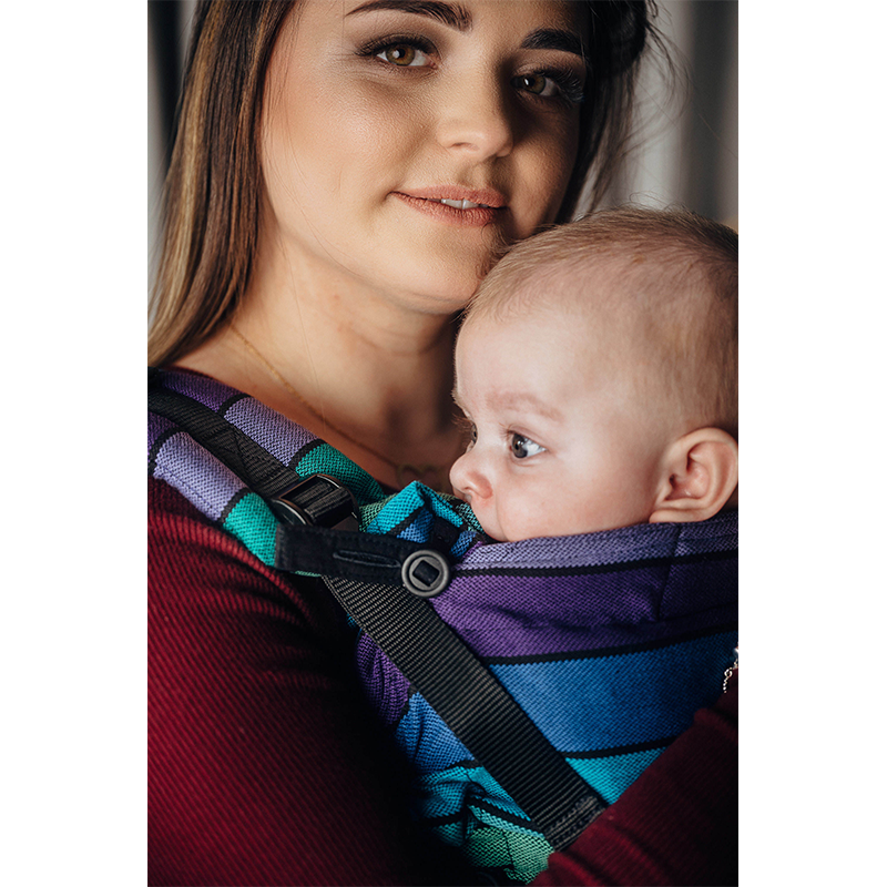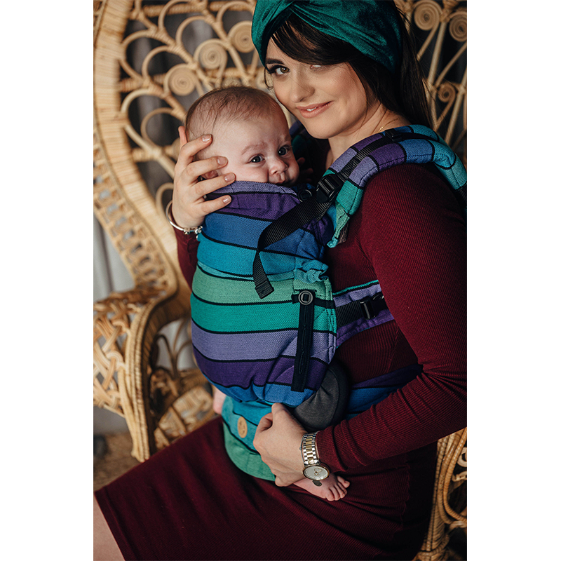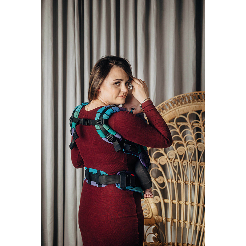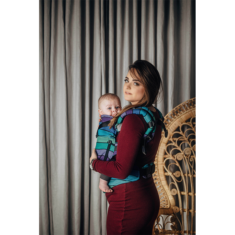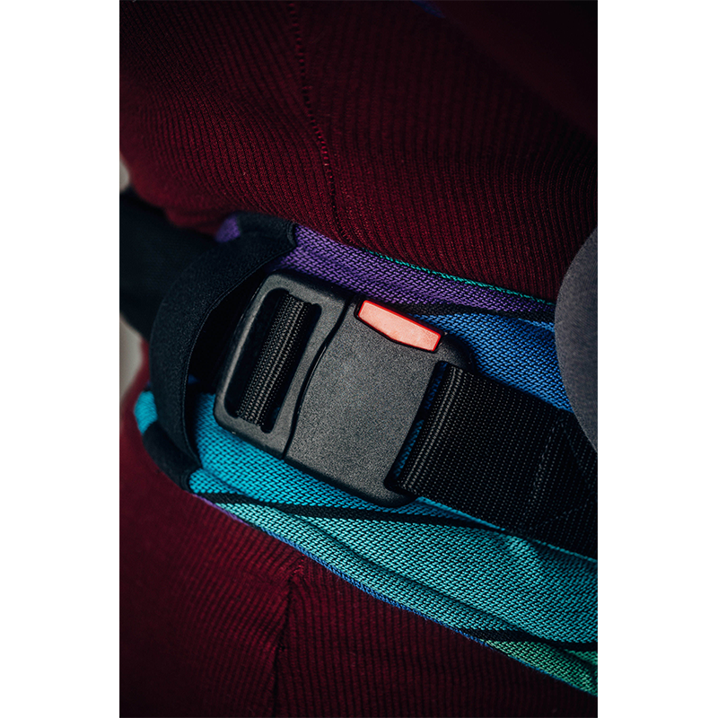 ATTENTION: Actual colors and pattern placement may vary from pictures. The color of the buttons can vary from the one presented in the pictures. Depending on the LOT of the product, the straps regulating the size of the carrier's panel can be solid black or in the colorway of the carrier.
