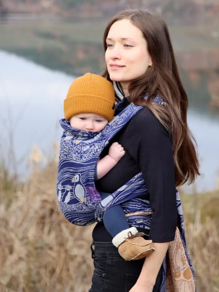 Designed in collaboration with tapestry artist Louise Oppenheimer, Puffins Arisaig baby carrier celebrates this iconic Scottish seabird.