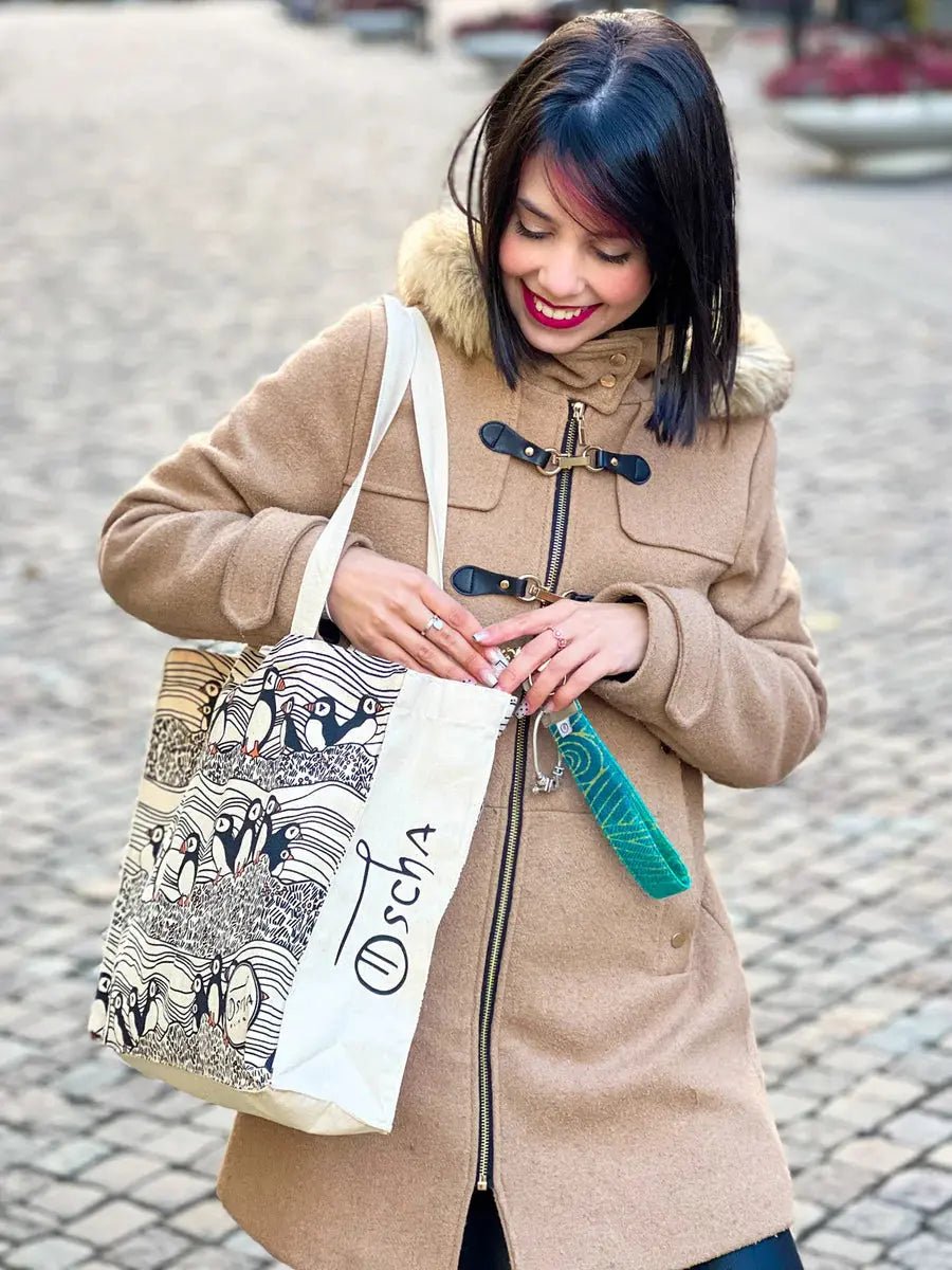 Oscha Eco Tote Bags are a sustainable and ethically handmade, each is screen-printed with a piece of original Oscha artwork. Now you can feel good and look stylish when reusing your Oscha designer bag for life!