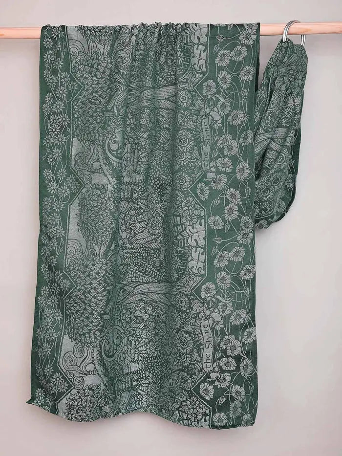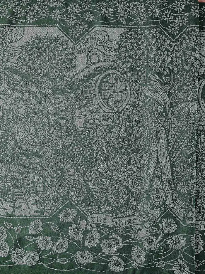 Shire Westfarthing is named after the Westfarthing, one of the four Farthings of the Shire and the centre of Hobbit authority. This beautiful fabric is woven on a deep forest green organic cotton backdrop. The bustling Shire pattern is picked out in alternating Tencel and hemp yarns in white.