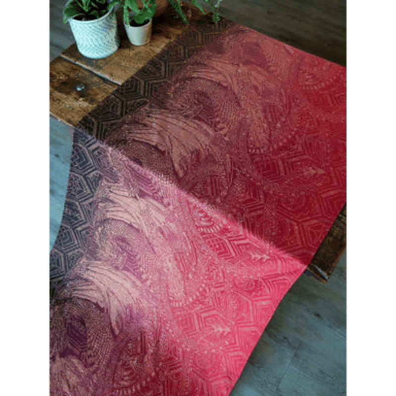 This fusion of our much-loved Smaug and Oakenshield patterns features the fearsome dragon in fiery colours against a background that transitions from a hint of black coffee to deep, rich burgundy, and finally fading to vibrant bright reds. The characteristic nubs and slubs of the silk weft that speckle the fabric resemble the sparkle from the shields that Smaug sits atop.