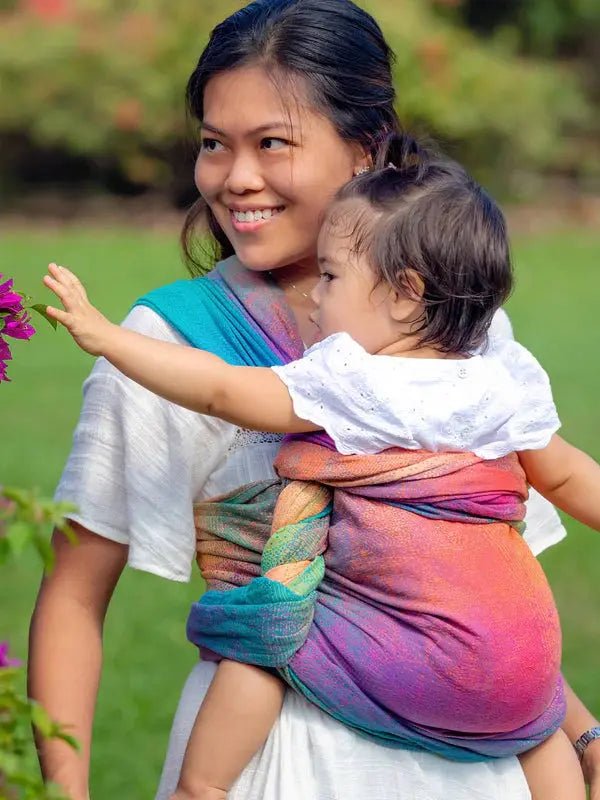 A striking fabric, Starry Night Aura baby wrap is woven with two different fades crossing over. The stars are speckled across this fabric, fading in and out through the explosions of colour. A true chameleon, this fabric will reveal new hues as it moves. This beautiful, shimmery fabric is woven with a hemp and cotton blended yarn for strength, cush and softness.