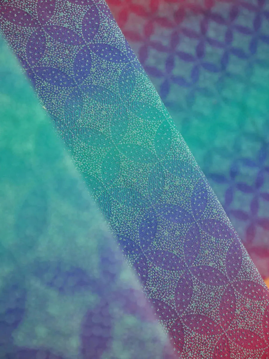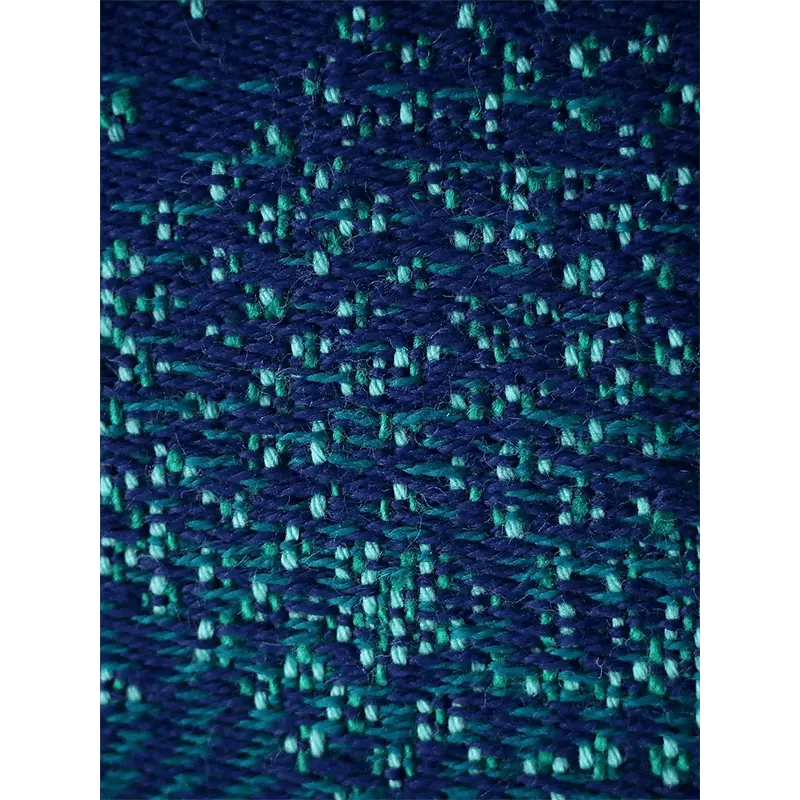 Woven with organic cotton and wild silk, this stunning baby Cairis carrier features an elegant starry night sky design on a striking rich jewel-toned mirrored grad, from magenta purple to deep teal and mulberry.