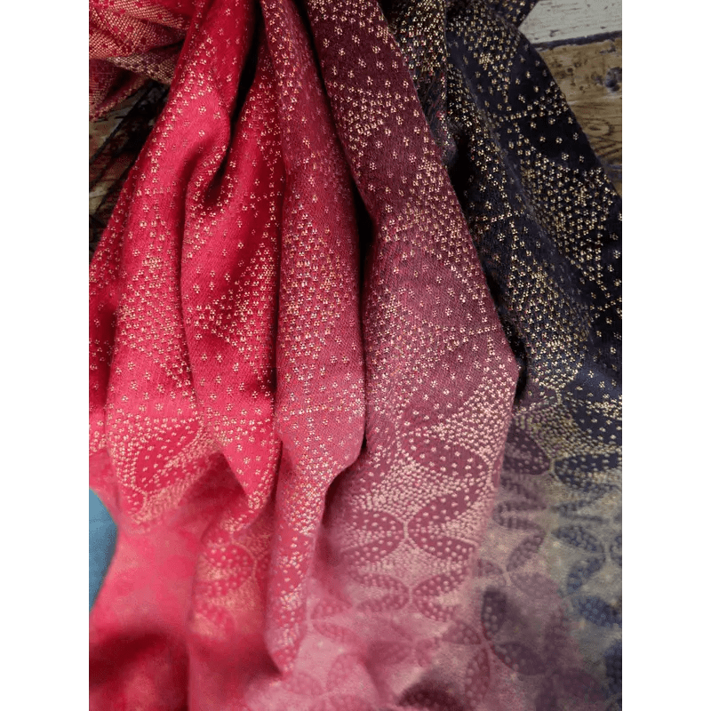 Our super chunky Viscose Linen Slub is back by popular demand. Viscose slub and linen are twisted together to offer a chunky cush and a little extra softness in your sling. Featured on our Red Moon warp the Inca gold Viscose Linen Slub alternates with a deep golden BCI organic cotton, creating an irregular cord-like effect across the Starry Night pattern.