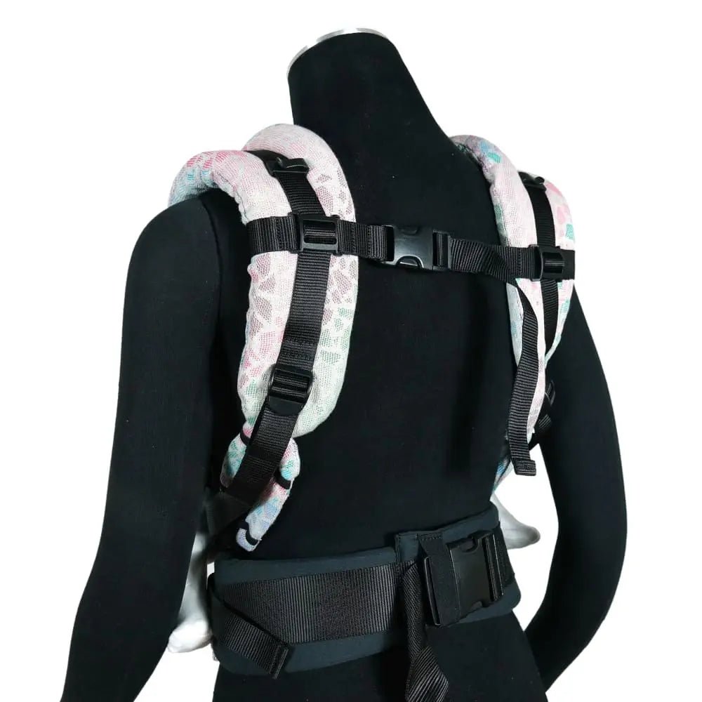 The shoulder straps are attached to the back panel with buckles. For smaller babies the straps are placed under baby’s legs and are clicked into the patented M-buckle, this will ensure that even the smallest babies are held firmly and securely in the correct spread squat position.