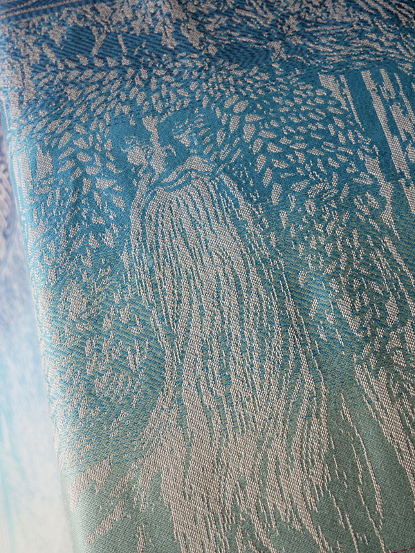 This fabric celebrates the slow passage of time, seasons, and guardianship of nature. The colour palette transitions smoothly from cool green and blue tones, representing the lush, earthy elements of the forest, to soft pinks and dark claret hues.