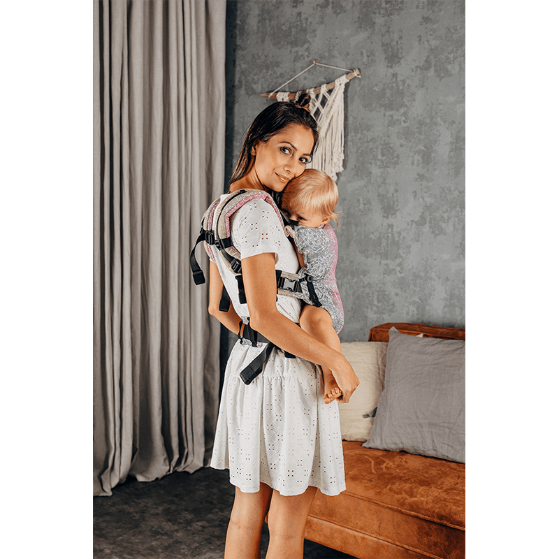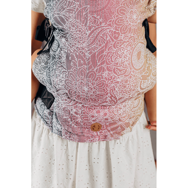 ATTENTION: Actual colors and pattern placement may vary from pictures. The color of the buttons can vary from the one presented in the pictures. Depending on the LOT of the product, the straps regulating the size of the carrier's panel can be solid black or in the colorway of the carrier.